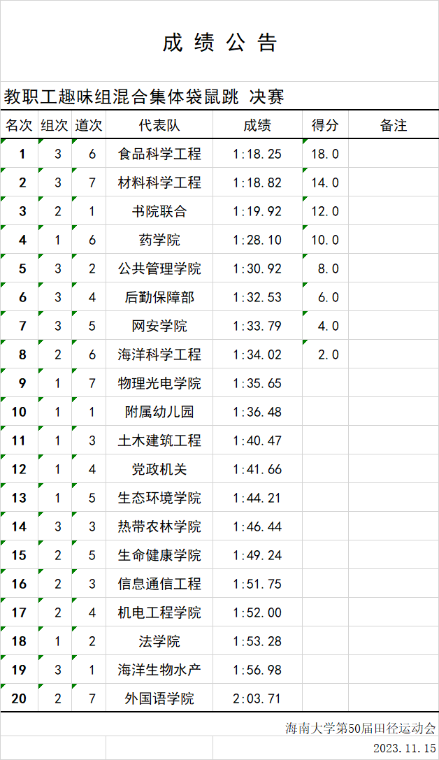 根据英国上市官网365第50届校运会成绩公告,365英国上市集团以1:18.25的成绩获得教职工趣味组合混合集体袋鼠跳决赛第一名!
